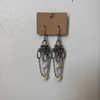 100% stainless steel handwoven chainmail earrings with freshwater pearls and foraged skunk bones.