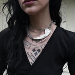 Stainless steel handwoven chainmail necklace with a foraged small mammal jawbone and freshwater pearls.
