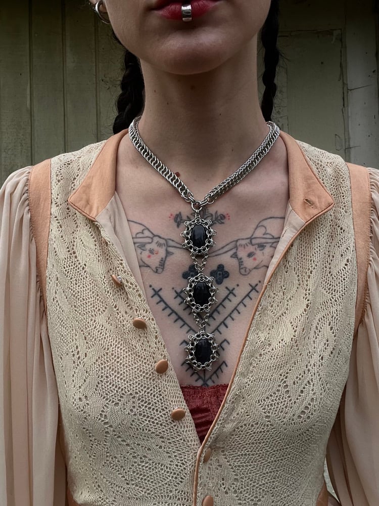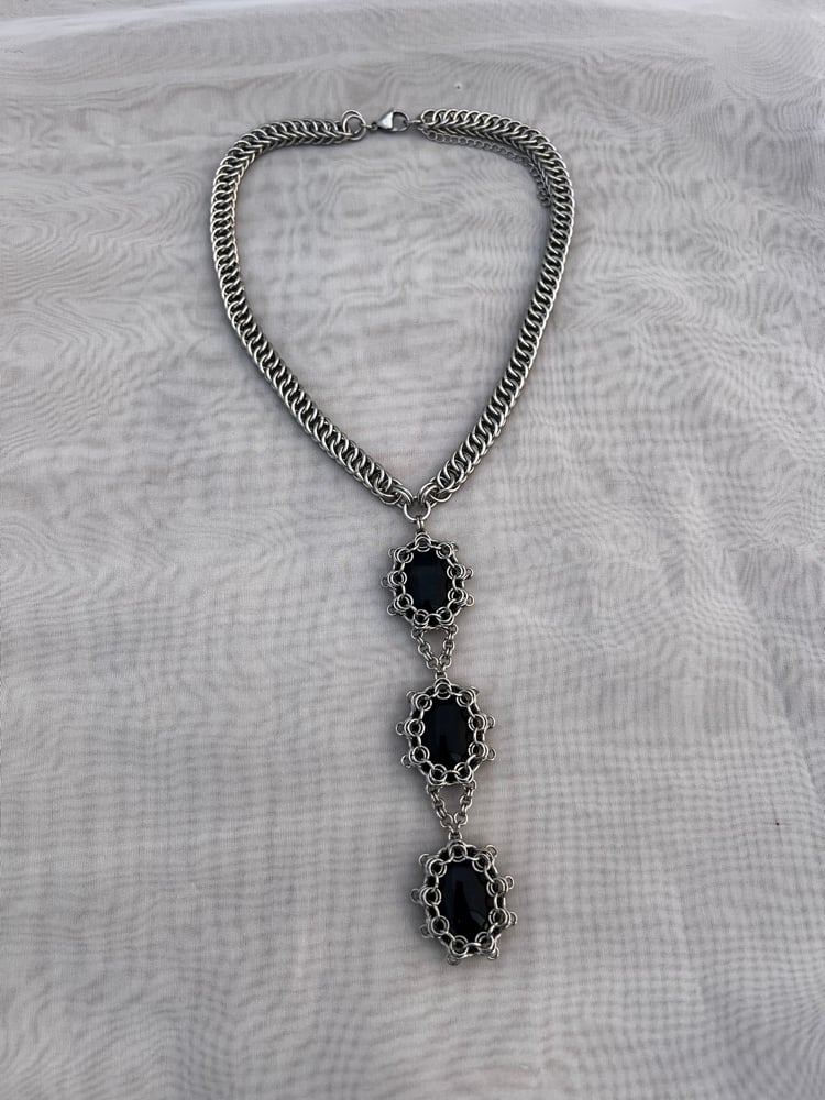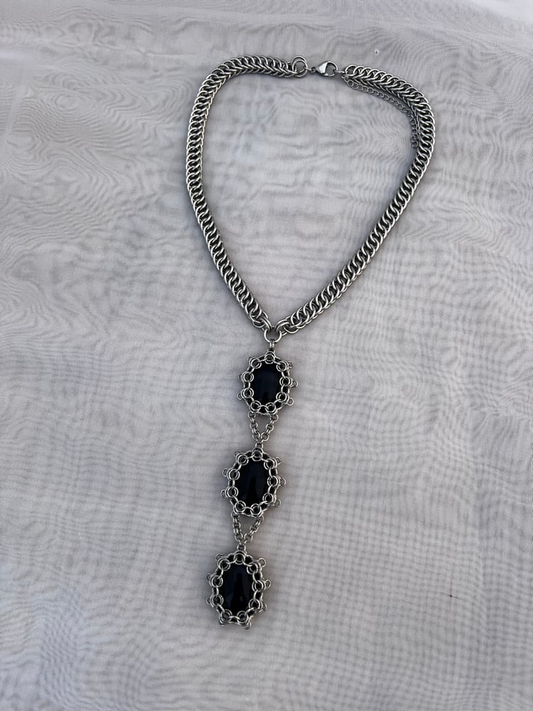 Stainless steel handwoven chainmail necklace with encased black glass pendants.