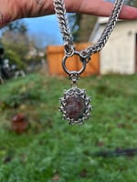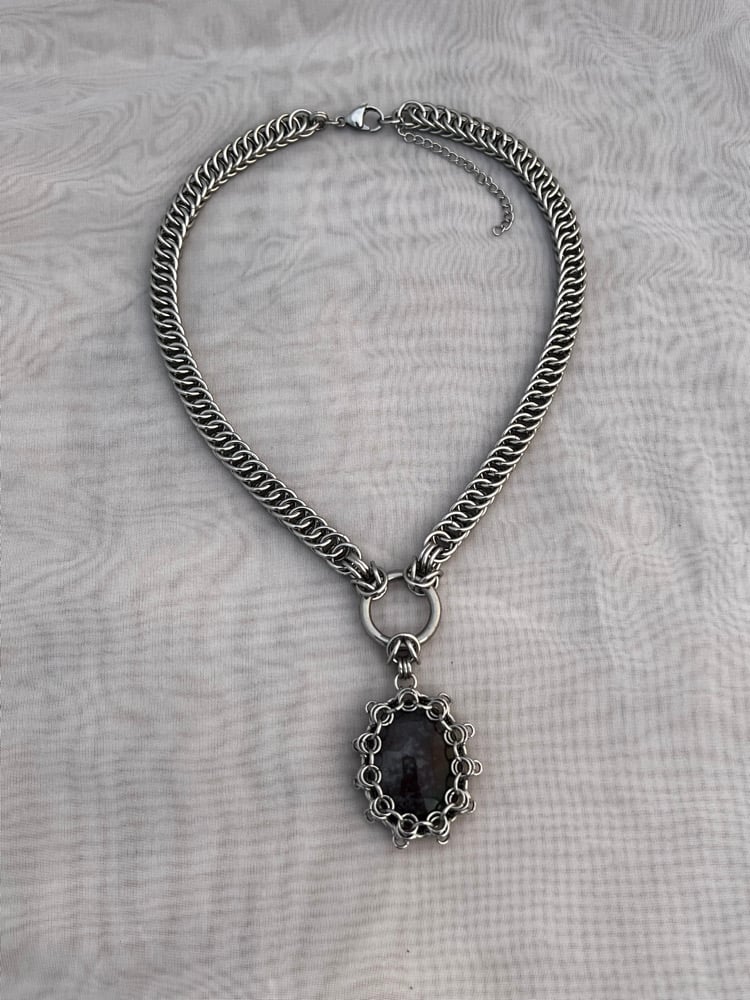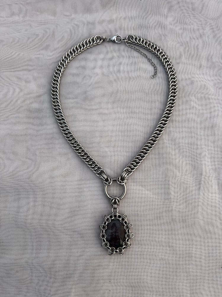 Stainless steel handwoven chainmail necklace with an encased fancy jasper pendant with purple and green hues.